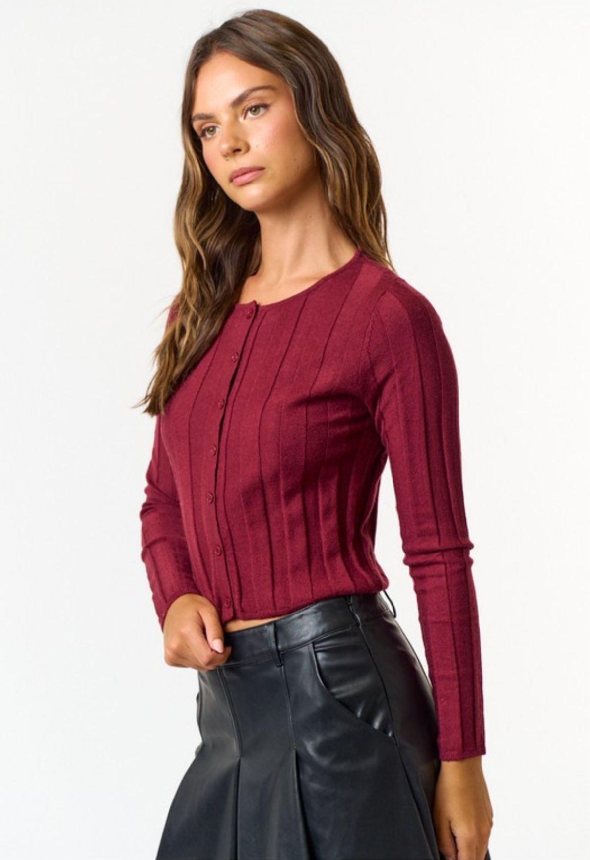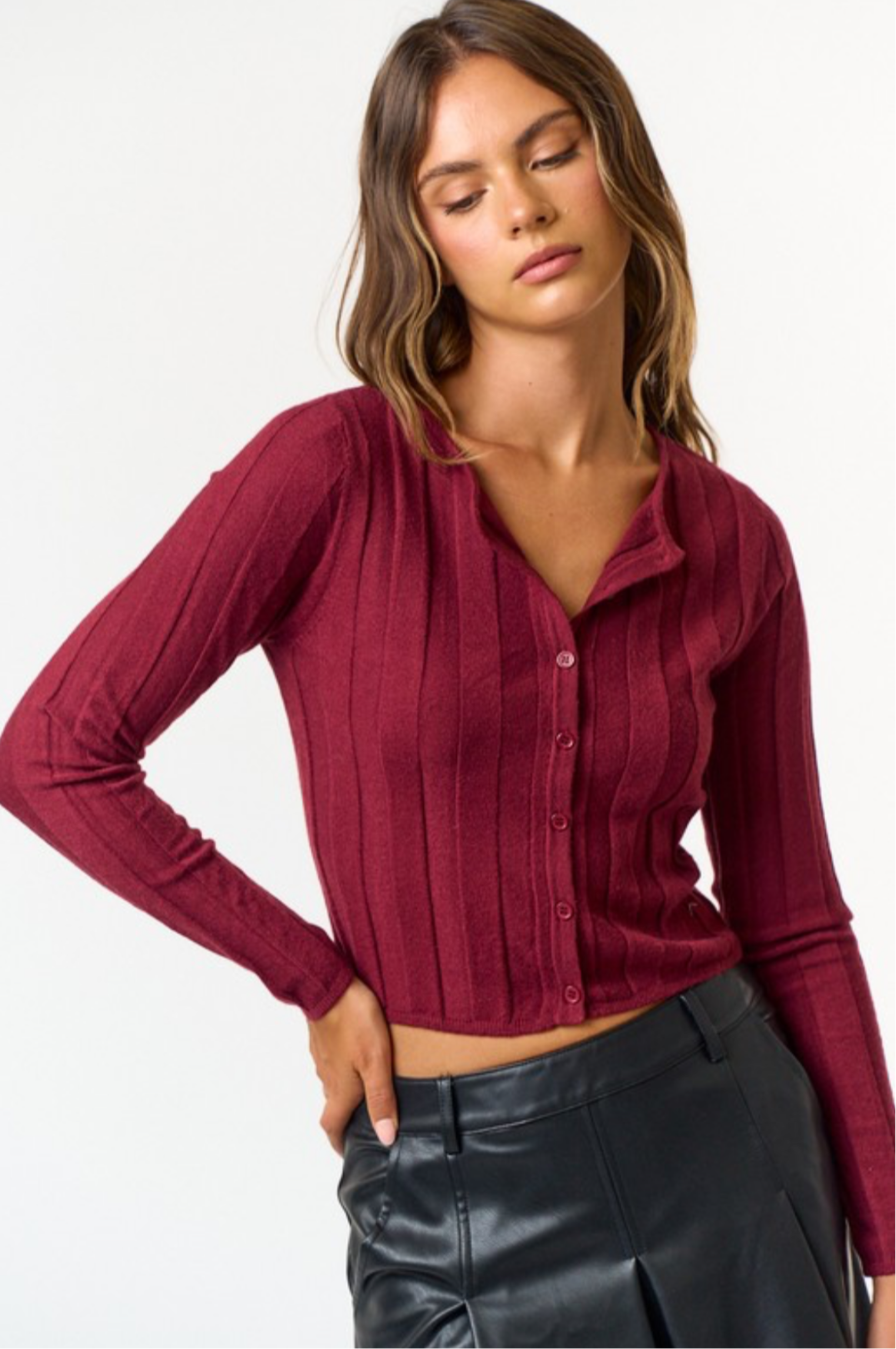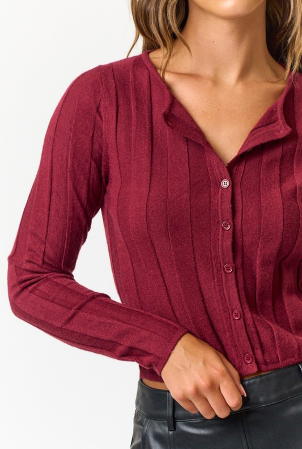 Our burgundy button up cardigan can be worn as tee and it features the perfect shade of burgundy; the color of the season . Pair it with our leopard print bubble skirts or with any of our pleated skirts for a fun fall forward look.