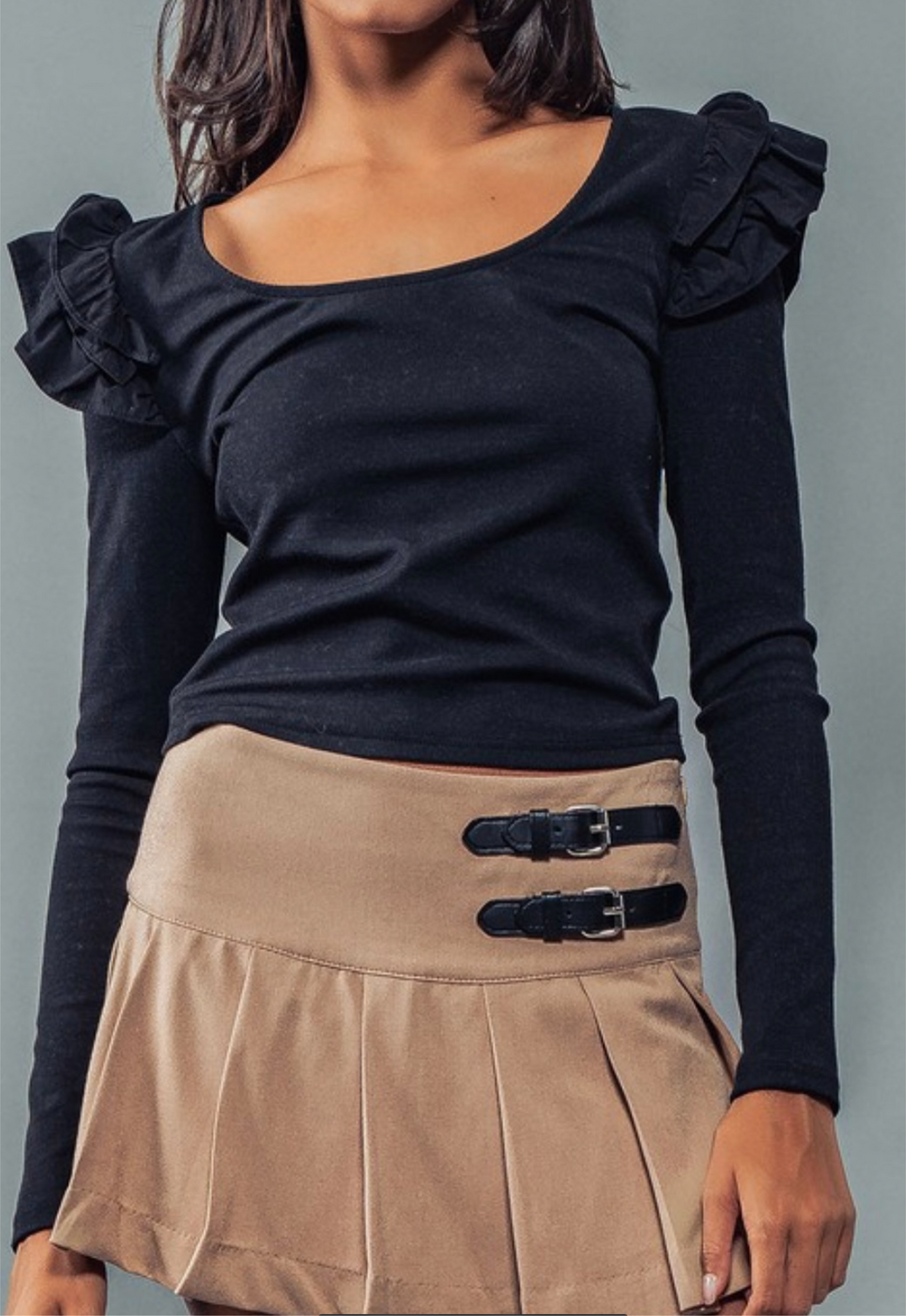 Pleated skirt in the most perfect camel shade featuring two buckles and built in shorts. They truly are a fall staple piece.
