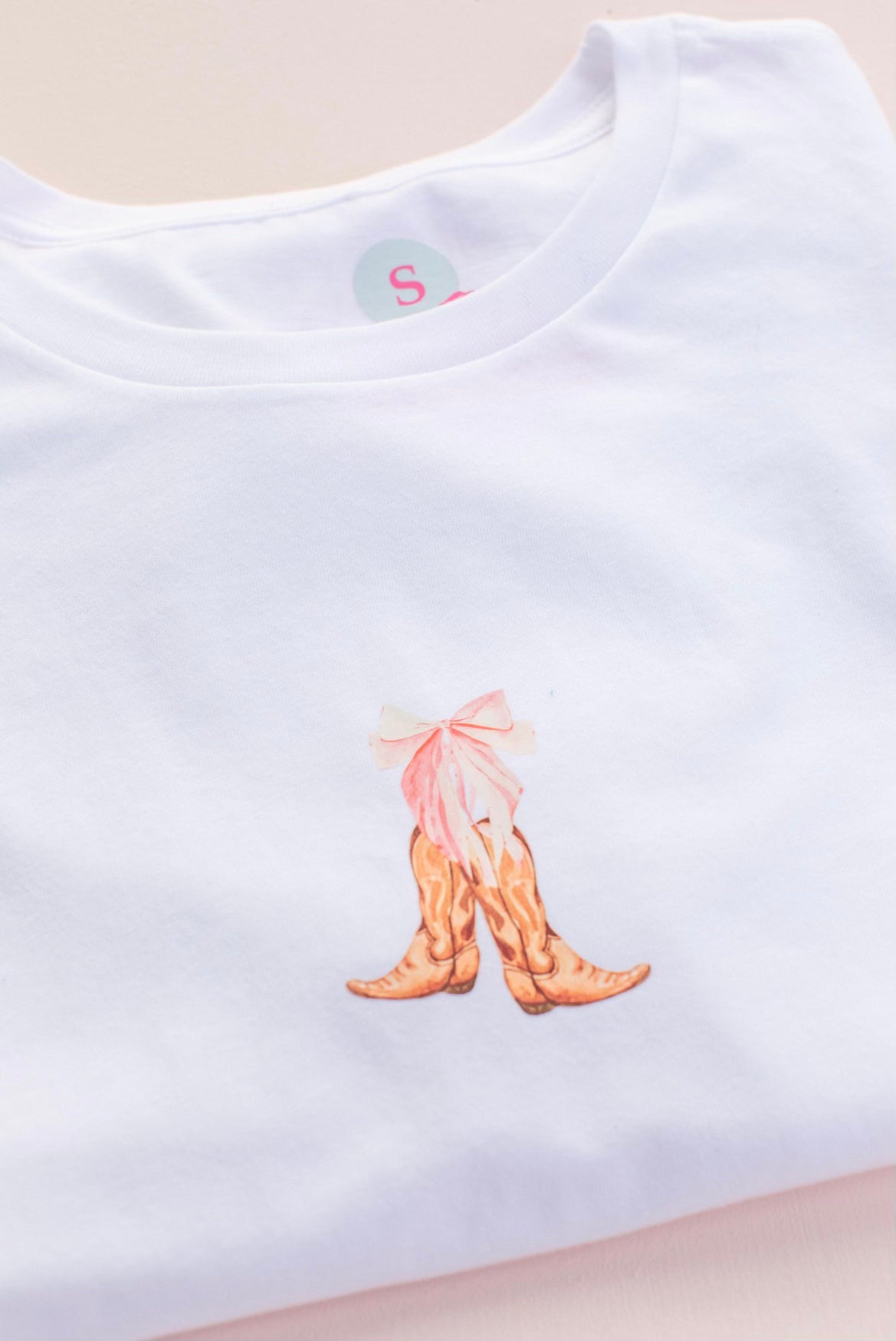 Our coquette cowgirl tee has the cutest print on it and is so soft . Made of 100% cotton and featuring a relax fit style, this top will be an everyday essential . Pair it with the matching tote for a flawless everyday look!