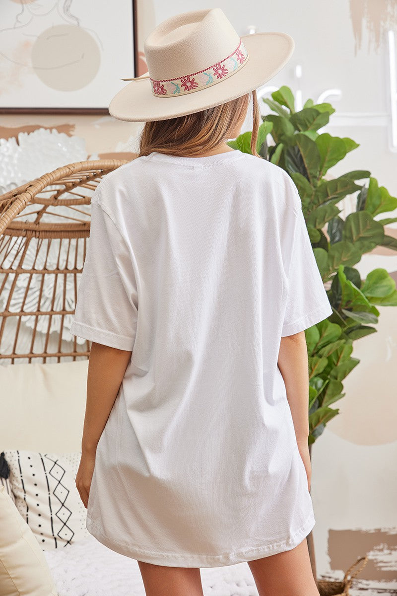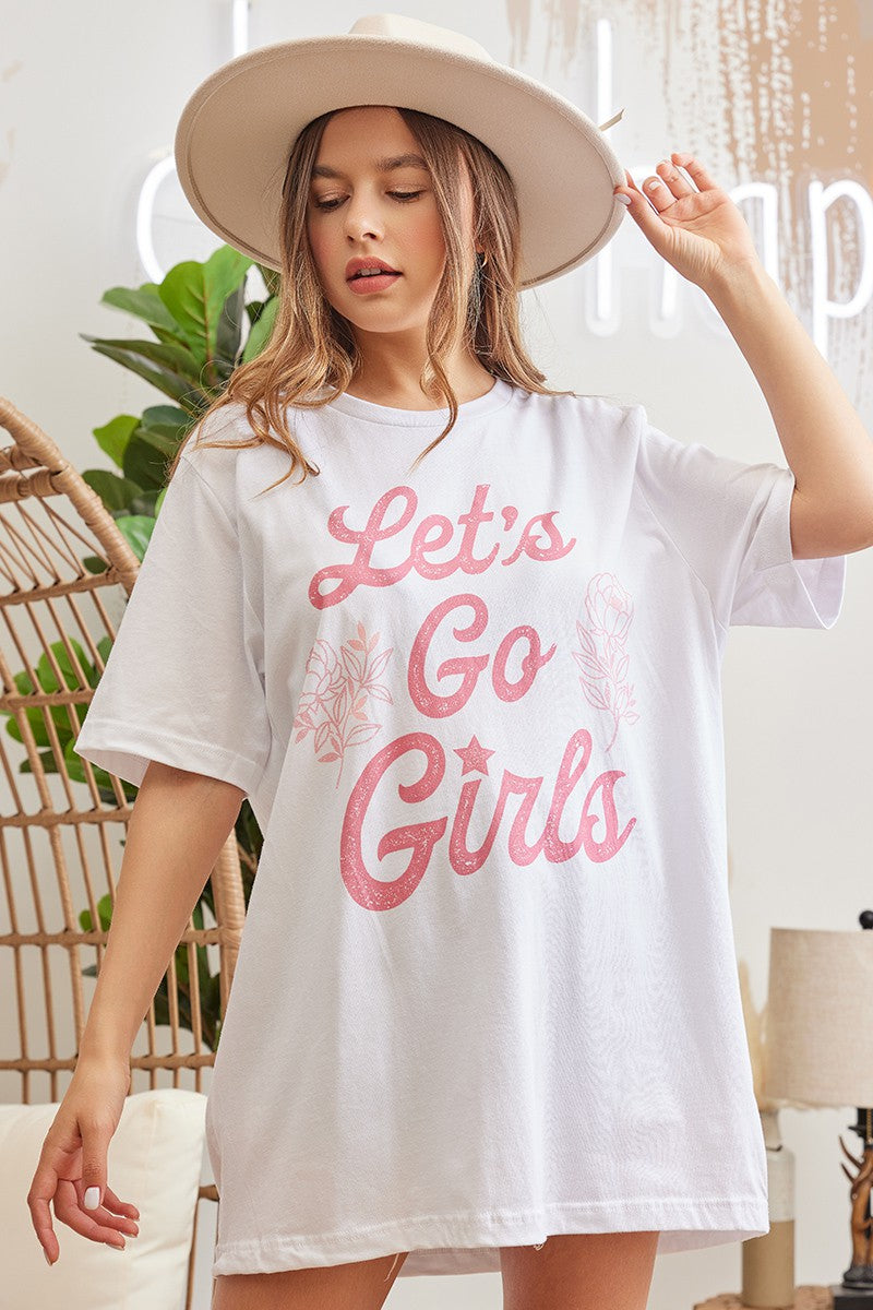 This tee has us ready to take on the world! Our Let's go Tee in white features an oversize fit and  a Vintage Script pink typography  that says 'Lets Go Girls' with floral illustrations. Pink color.