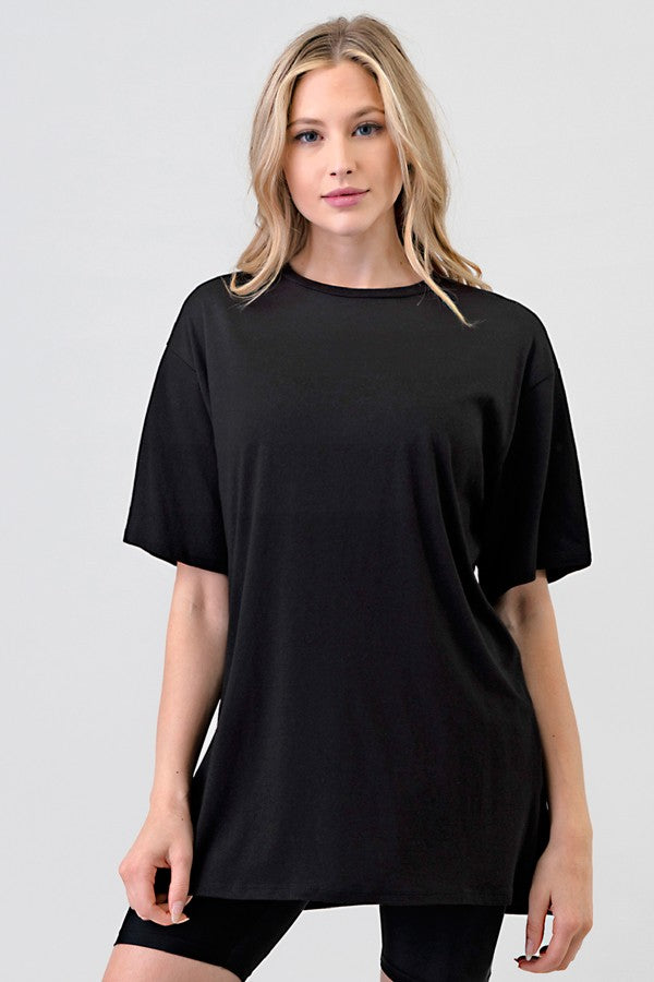 We are loving this basic crewneck scoopneck tee.it's so versatile. It features a short sleeve cut lightweight feel. It'll be the prefect addition to your fall wardrobe. Plus we love the oversized fit. It's perfect for any day on the go or a great layering piece. Pair this tee with our basic lounge shorts for a chic, sporty look or. dress it up with bike shorts and an oversized blazer!