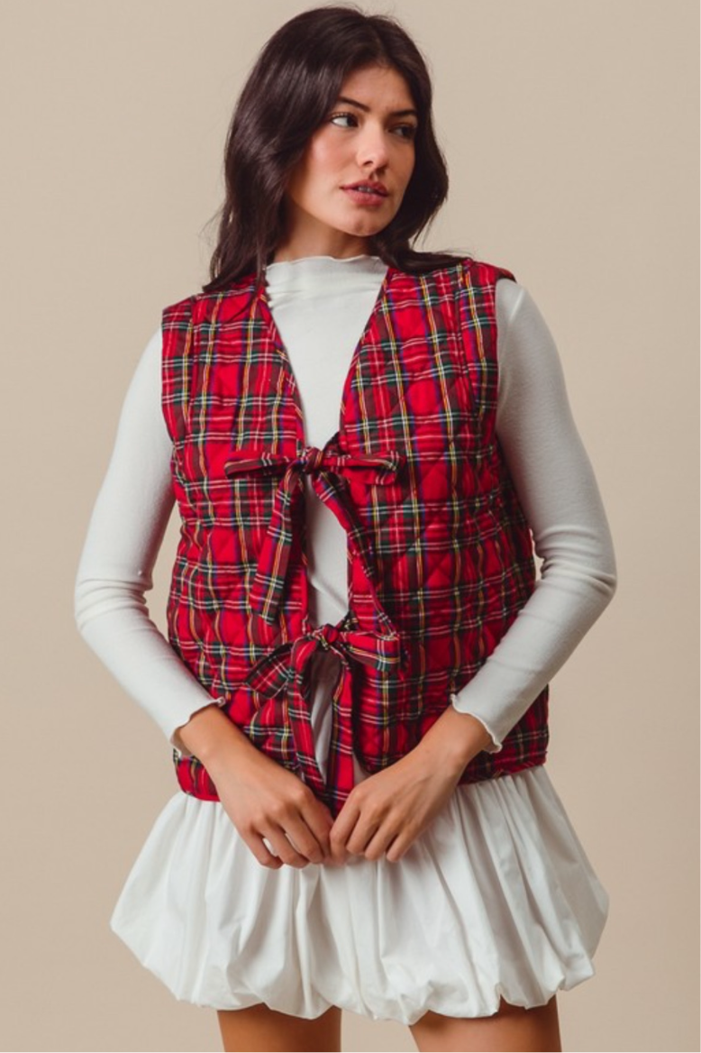 Our 2 strap Padded plaid print vest features a soft texture style and two tie front