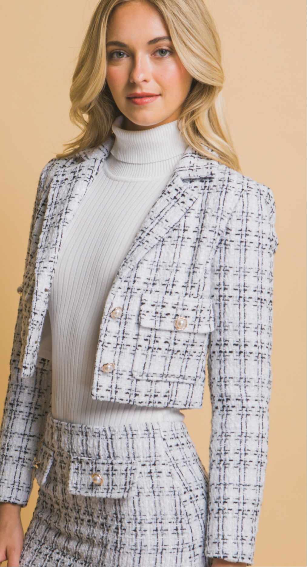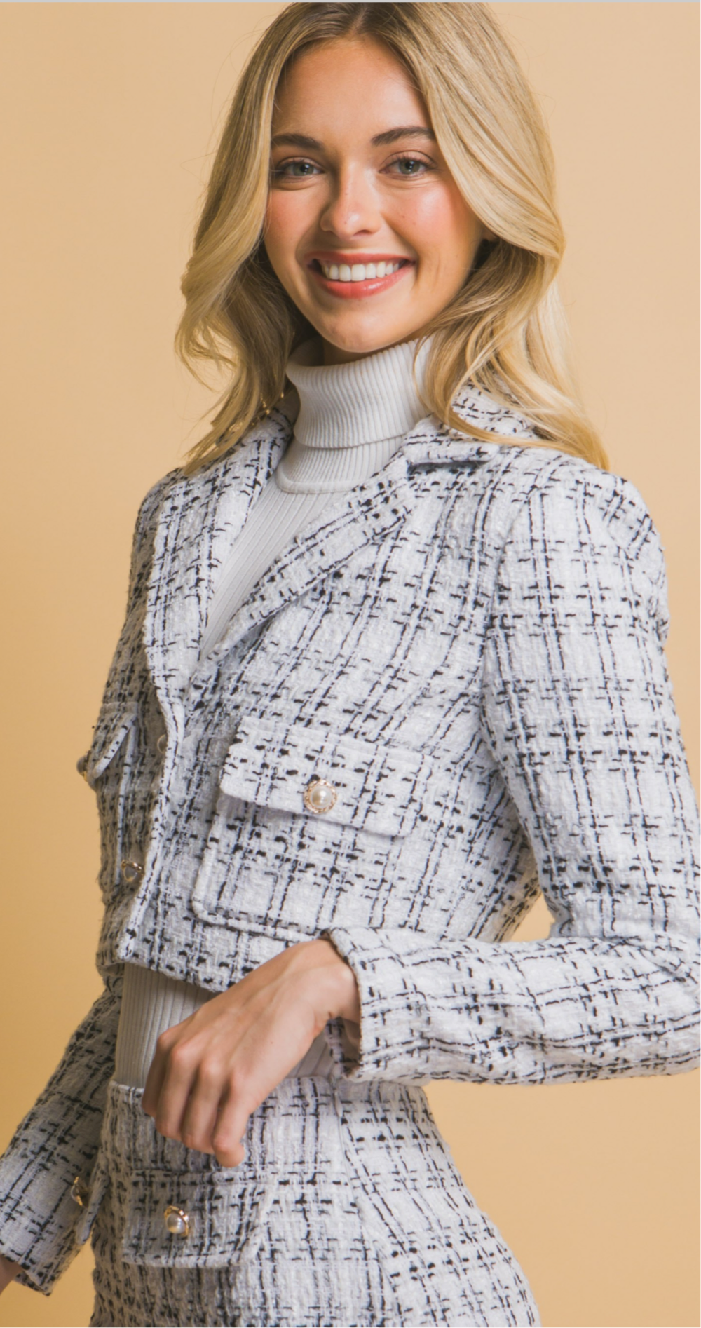 Tweed set in black and white featuring a Beautiful jacket in a crop length, and a matching skirt with a side zip closure.